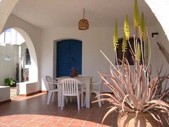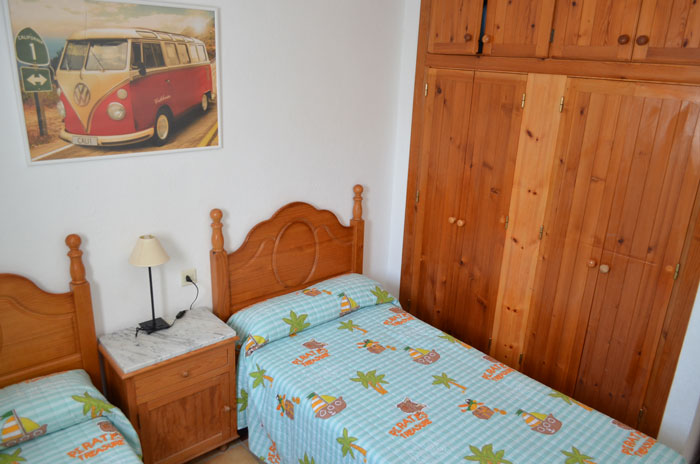 Gran Patio-Terraza, salón, cocina, cuarto de baño, y dos habitaciones una con dos camas individuales y otra con cama doble.